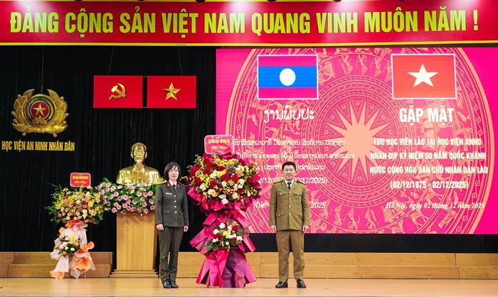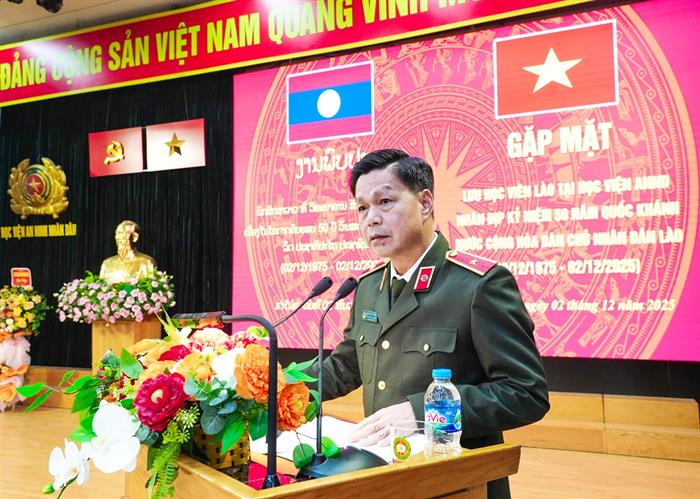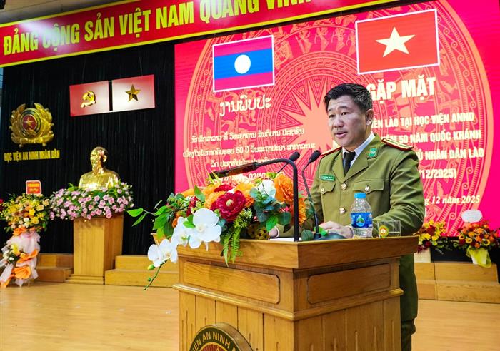 Thay mặt Đảng uỷ, Ban Giám đốc Học viện ANND, TS, Thiếu tướng Nguyễn Văn Thiết - Phó Giám đốc Học viện chúc mừng lưu học viên Lào đang học tập tại Học viện nhân dịp kỷ niệm 50 năm Ngày Quốc khánh nước Cộng hoà Dân chủ nhân dân Lào. Đồng chí Phó Giám đốc khẳng định, trong những năm qua, thực hiện chương trình hợp tác toàn diện giữa Bộ Công an Việt Nam và Bộ Công an Lào, Học viện đã và đang đào tạo, bồi dưỡng hàng trăm cán bộ an ninh Lào ở các bậc học, trình độ. Đào tạo cán bộ an ninh có trình độ cao cho Bộ Công an Lào là nhiệm vụ quốc tế cao cả mà Đảng, Nhà nước, Bộ Công an Việt Nam tin cậy giao cho Học viện. Đồng chí Phó Giám đốc cũng nhấn mạnh, Học viện ANND đã cử nhiều đoàn cán bộ, giảng viên, chuyên gia sang hỗ trợ, giúp đỡ Học viện An ninh nhân dân Lào xây dựng chương trình đào tạo, cung cấp hệ thống giáo trình, tài liệu dạy học, điều đó đã minh chứng cho tình đoàn kết gắn bó đặc biệt giữa Bộ Công an Việt Nam - Bộ Công an Lào và giữa Học viện ANND Việt Nam và Học viện ANND Lào ngày càng vững mạnh.