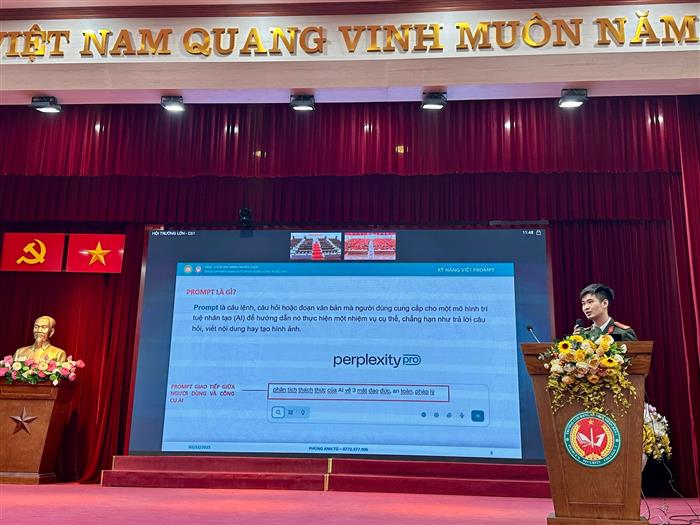 Thực hiện ý kiến chỉ đạo của Đảng ủy, Ban Giám đốc Học viện, Khoa NV7 chủ trì nội dung truyền đạt tại T08. Trong khuôn khổ chương trình, PGS.TS, Đại tá Nguyễn Đình Nghĩa - Trưởng Khoa NV7 trực tiếp truyền đạt chuyên đề tổng quan về trí tuệ nhân tạo. Đồng chí đã trình bày xu thế phát triển AI trên thế giới và tại Việt Nam; phân loại AI, giới thiệu các công nghệ cốt lõi làm nền tảng cho ứng dụng AI hiện nay; đồng thời phân tích tác động của AI đối với công tác giáo dục, đào tạo trong các học viện, trường CAND.